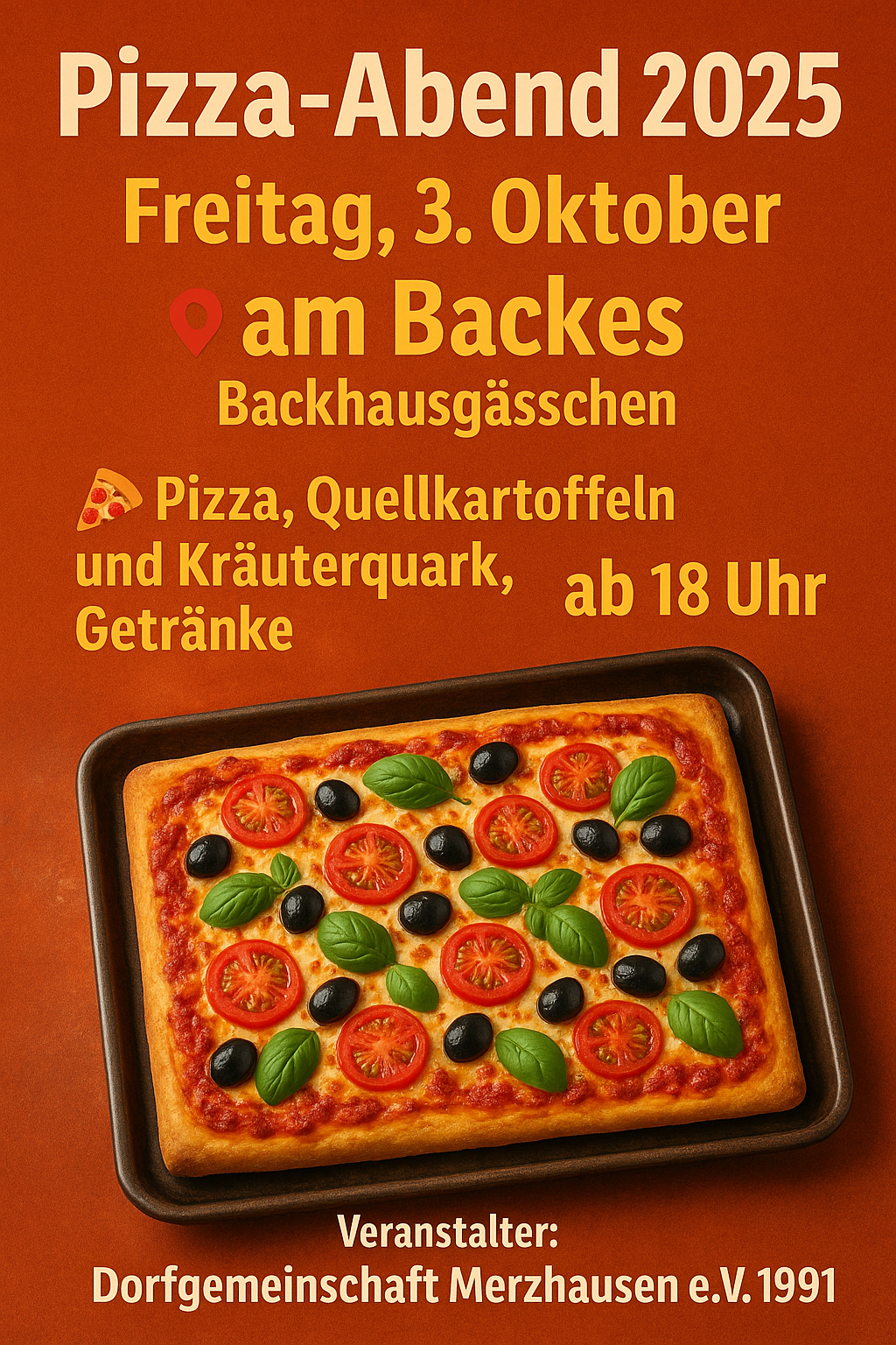 Es ist angerichtet! Am Freitag, 03. Oktober lädt die Dorfgemeinschaft Merzhausen ab 18 Uhr zum beliebten Pizza-Abend am Backes ein.